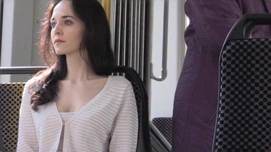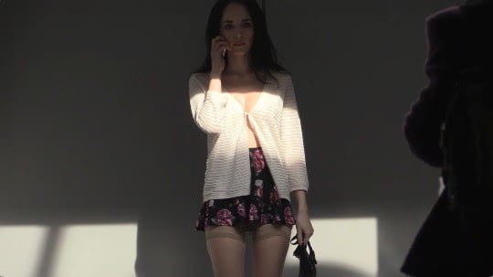 美人でスレンダーで上品な感じの出演女性。ルックスもメイクもヘアースタイルもファッションモデルみたいです。シンプルな服装も上品に着こなし、太もも丈のストッキングも似合います。