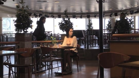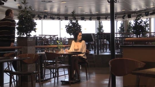 片方のオッパイだけ丸々露出。とぼけて食事。