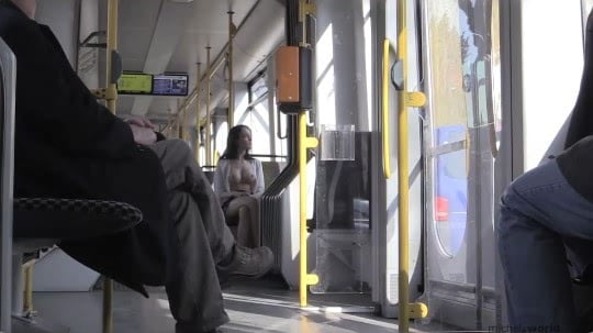 いよいよ最終段階。電車内での着衣オッパイ露出。左右のオッパイを大胆に丸出ししています。