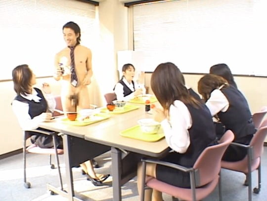 そこへ、もう1人女子社員がやって来ました。イイ感じにCFNMが強調されました。女性5人の中に全裸男が1人です。
