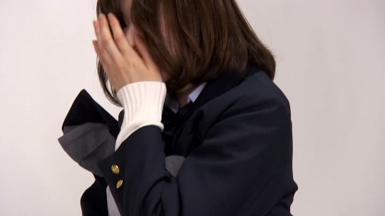 ノーパンで自分でスカートをめくっておきながら、オマンコを手で隠しています。