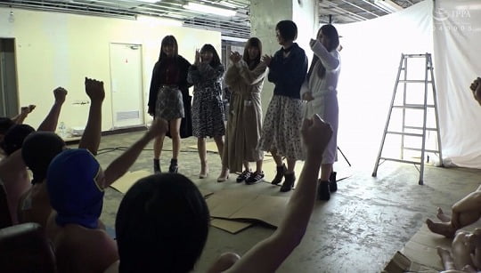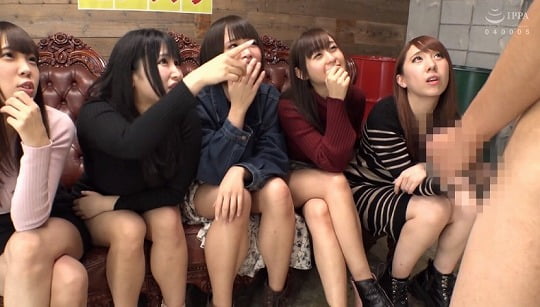 さて、変態どもが待機している巣窟に、やって来た女性陣。「自分(女性)たちは脱がないで、変態露出狂オナニー野郎を見てバカにする」という面々です。・・・・気楽だから、早くも盛り上がっています。