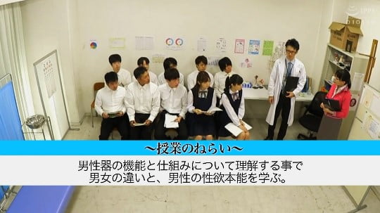 保健室に集められた男子生徒と女子生徒。この授業の狙いは「男性器の機能と仕組みについて理解する事で男女の違いと、男性の性欲本能を学ぶ」とあります。女子にとっては、とても参考になる性教育授業です。
