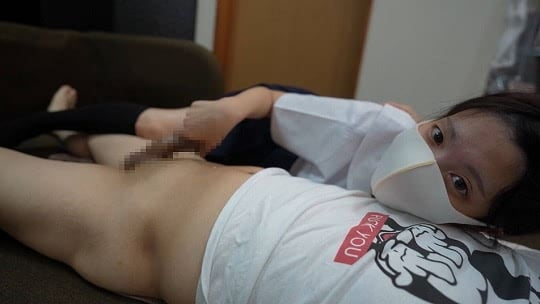 本格的な手コキプレーへ。片手でペニスの根元をおさえて片手で亀頭コキ(亀頭責め)したり、逆手手コキしたり。CFNM添い寝手コキしたり。乳首舐め手コキの構えですが、顔出しNG(マスク姿)。