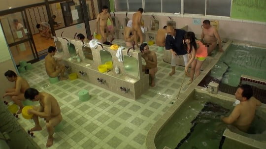 浴場内は、十分な人数の男性客です。全裸フルチンの男達が沢山!その中に入ることになる女子アルバイト。