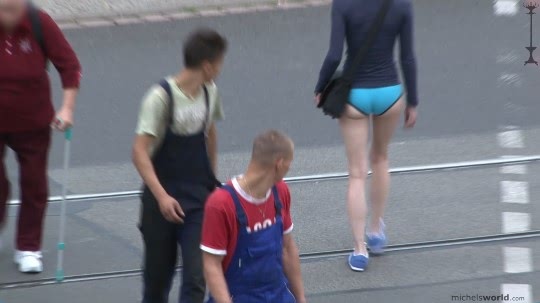 パンツ(姿)露出歩行は、日本の野外露出ビデオでもよくありました。と言っても、下着姿(ブラジャーとパンツ)であり、当作品のようなズボンだけ脱いだような格好は、ほとんどありませんでした。