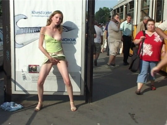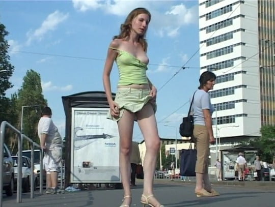 階段を上りきると、そこは路面電車の停留所。美人で抜群のスレンダースタイル、オシャレなヘアースタイル、大胆な露出ファッション。こうして見ると、まるでファッションモデルの撮影のようです。
