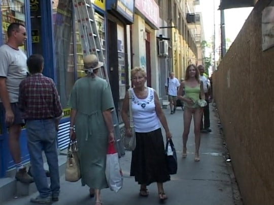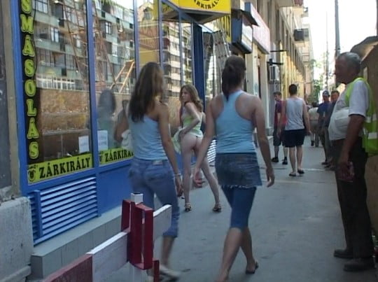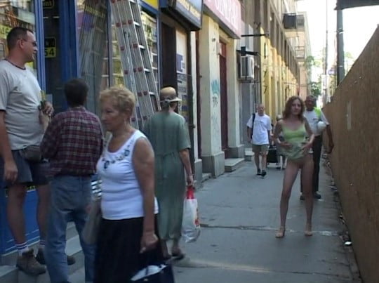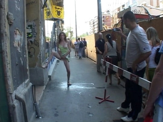 彼女の立ちションで横断している地面の小便。通行人はそれをまたいで行きます。