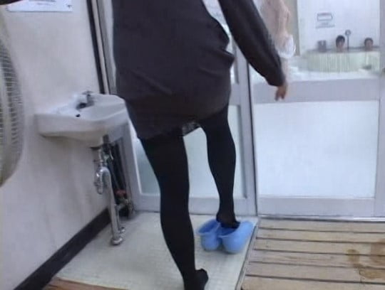 男湯の脱衣所のモップ掛けをしていきます。私服のままのなのが、かえってグッド。