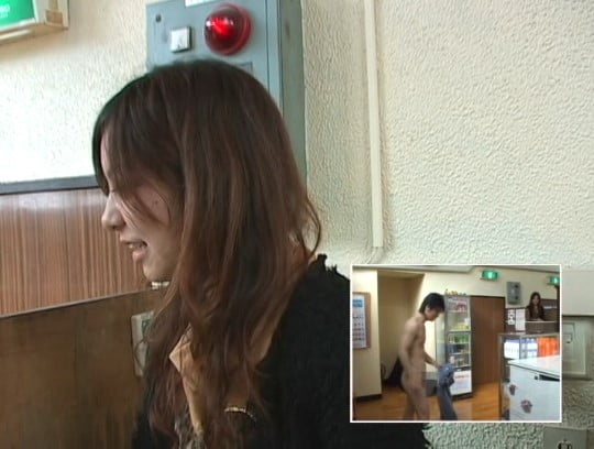 裸の男性客がいるところへ入っていく着衣女子。