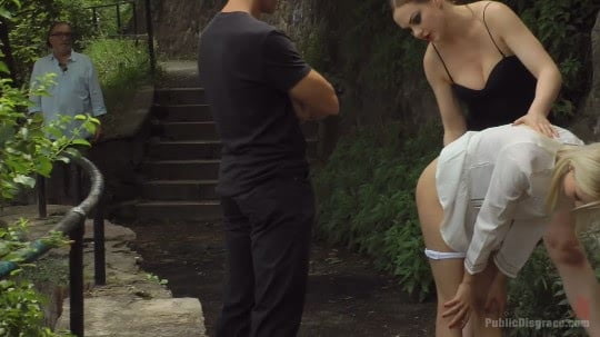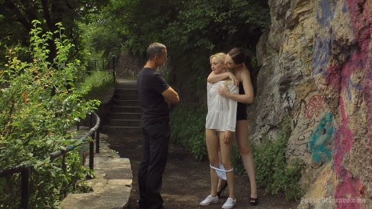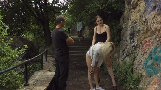 ハイキングコースのような所へ連れてこられた彼女。白い服着た女の子が「Melanie」です。調教師はS女とS男の2人です。