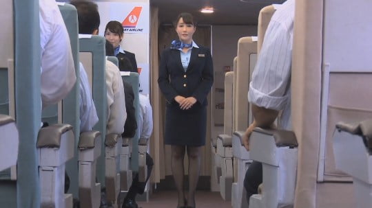 それっぽく振る舞う女性たち。AV女優とおもえないほど仕上げてきています。そして女性の機内アナウンスが流れます。「キャビンアテンダント4人のオマンコをご紹介させていただきます」