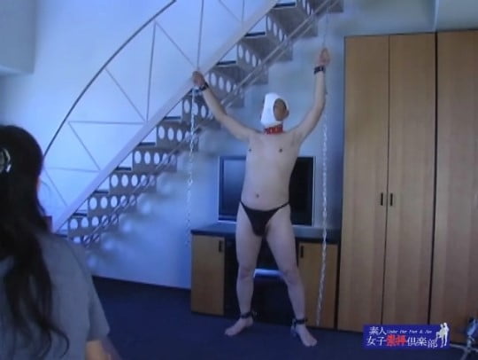 男のパンツを引っ張り上げて、睾丸責め。圧迫しつつ乗馬鞭でペシペシ叩きます。あくまでもソフトな責めですが・・・・個人的にはそれでイイです。